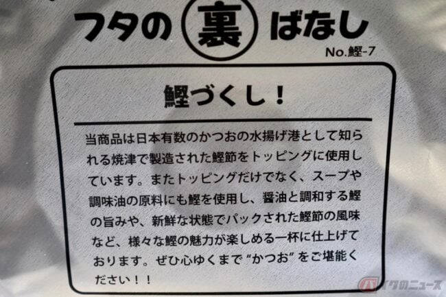 ニュータッチブランドによる商品説明には「静岡県は人口が多く、また有数な観光地を抱え他県からの観光客も多く訪れ、ご当地ラーメンの開発テーマとして見逃せない土地柄です。そこで弊社では鰹の水揚げ量が日本一で、全国的に名高い焼津に注目し、特産品である鰹節を使用したラーメンを開発しました。ラーメン店でトレンドである魚介豚骨スープに焼津産鰹節だしの旨みを効かせ、トッピングも見た目を華やかにする焼津産鰹節を入れました。」と記載されています。