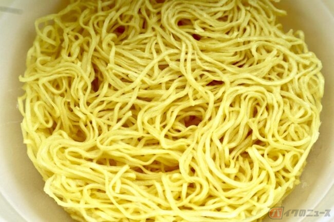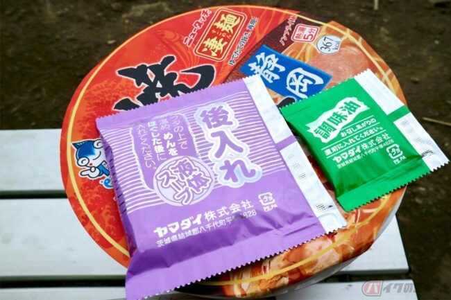 麺はスープによく絡みそうな細麺です。この辺りのバランスが人気の秘訣かなと想像しつつ、かやくを入れて熱湯を注ぎ待つこと5分。その間、蓋の上で後入れタイプの液体スープと調味油を温めておきます。