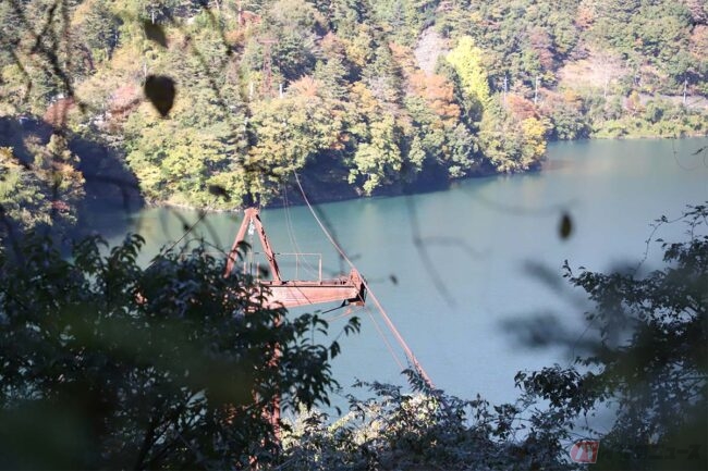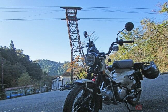 その光景に出会ったのは、ホンダ「CT125ハンターカブ」で東京都奥多摩方面へとツーリング取材に行った時のことでした。首都圏のライダーにはおなじみの走りどころ、奥多摩周遊道路のとあるパーキングで休憩をしていたところ、ふと脇を見ると古びた鉄塔と、そこに張られたワイヤーケーブルが目に入りました。奥多摩周遊道路脇の山中から、湖の対岸へとワイヤーが伸びているようです。