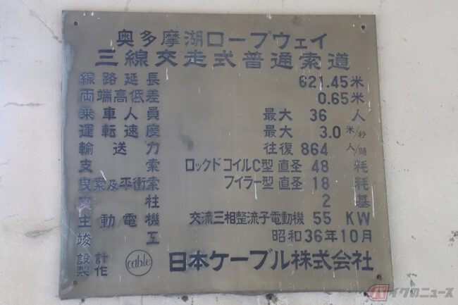 この奥多摩湖ロープウェイは、1962年1月に営業を開始し、奥多摩湖を渡った対岸の「かわの」駅との間622mを結んでいました。当初は奥多摩湖を一望できるということで人気を博したらしいですが、湖を横断する橋ができたことで客が激減し、わずか4年ほどで運行を終えたそうです。