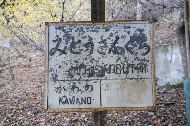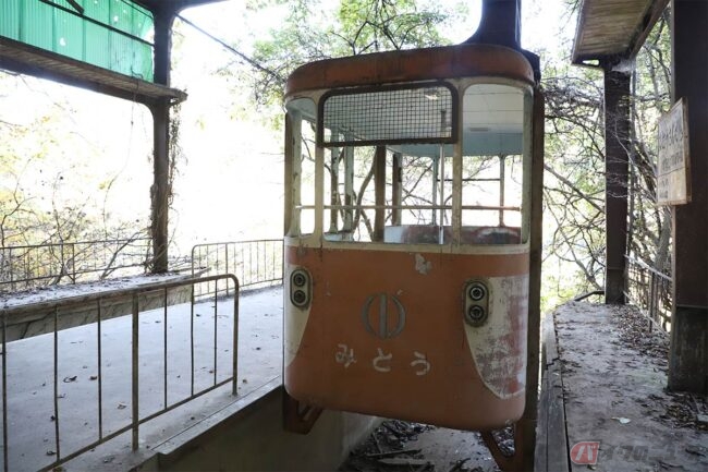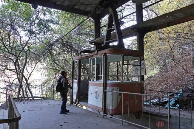 走っていたら気付かずに通り過ぎていましたが、よく見ると道路沿いから山肌に古い階段が伸びています。それを伝って上ること数分……林の中にコンクリート製の建物が姿を現しました。派手な落書きがあり少々不気味な雰囲気ですが、思い切って中を覗いてみました。すると建物の壁には『奥多摩湖ロープウェイ』というプレートがあり、さらに奥へと進むと、ロープウェイのゴンドラが、いまにも動きだしそうな雰囲気でそのまま残されていたのです。まるで時が止まったかのようなプラットホームには「みとうさんぐち」と読める駅名板も残っていました。