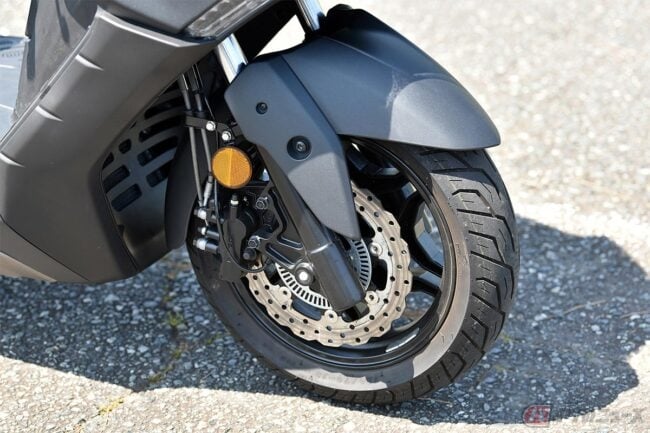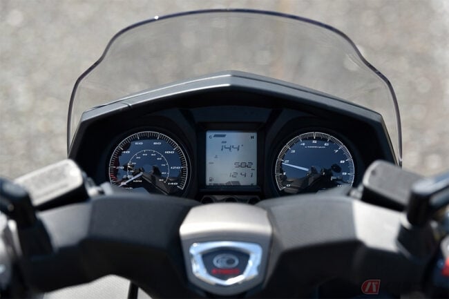 大柄な車体にネガティブな要素はなく、ハンドリングにはむしろ好影響をもたらしています。足まわりはフロントにテレスコピックタイプの正立フォーク、リアにツインショックを装備し、それぞれに13インチ径のホイールを組み合わせるオーソドックスなものですが、スクーター特有の軽々しさがなく、タイヤはしっとりと路面をトレース。路面が少々荒れていても、常にツアラー的な落ち着きを見せてくれました。