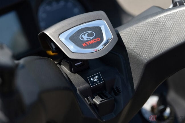 もちろんスクーターですから利便性もしっかり追求されています。容量たっぷりのシート下スペースには当然フルフェイスのヘルメットが収納できるほか、12Vの電源ソケットも装備。さらにハンドル中央に備えられたロゴプレートを開くとUSBコネクターがあらわれ、スマートフォンとの接続が容易になっています。