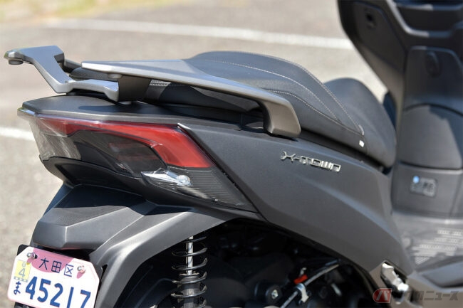 ライダーである僕(筆者:伊丹孝裕/身長174cm)がまたがっている写真からも分かる通り、なにより印象的なのは車体サイズでしょう。ピンクナンバーの原2クラスとは思えないほど風格があり、雰囲気は完全にビッグスクーター(250ccクラス以上)のそれ。キムコには、排気量550ccの並列2気筒エンジンを搭載したフラッグシップ「AK550」というモデルがあるのですが、全長はこの「X-TOWN」が上回っているほどです。