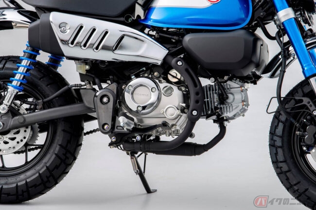 そのほか、新しいカラーリングを採用した最新のモンキー125では、オフセットシリンダーやバルブギアのローラーロッカーアームなどの低フリクション技術を採用することで、1.5L/100km(WMTCモード)の経済性を実現しています。