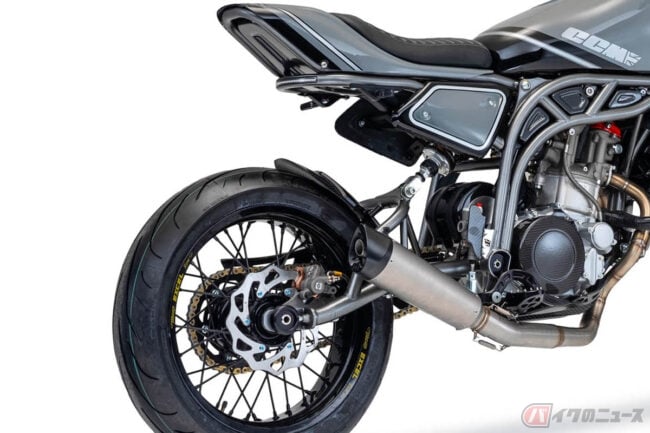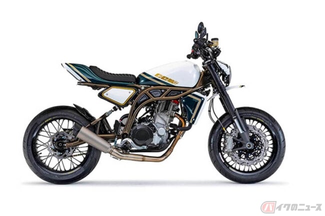 また、外装面においては小ぶりななタンクにダートトラッカー風のシングルシートカウルを装着。前後17インチのスポークホイールにはAvon製3D Ultra Evoタイヤが備えられています。