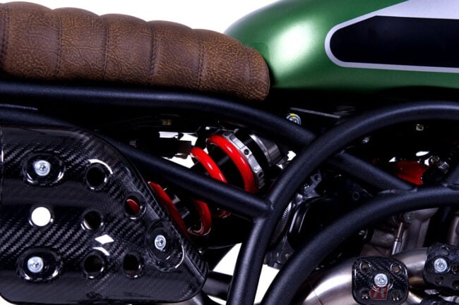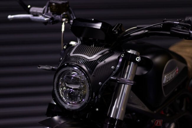 上品な印象を与えるMaverickは、同社の「Street Tracker」や「Street Moto」と同じく排気量600ccの単のビッグシングル・エンジンをトレリスフレームに搭載したモデルで、サテン・エメラルド・グリーンまたはサテン・アブソリュート・ブラックのボディにカーボン製のフロントカウルを装着。
