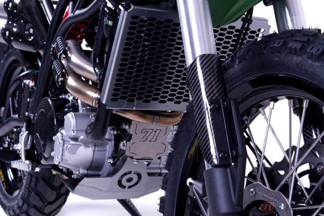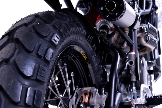 CNC加工のエンドキャップを備えたブラシ仕上げのツインサイレンサーやMitas E7+デュアルスポーツタイヤ、Black J Juanディスクブレーキシステムなども標準装備となっています。
