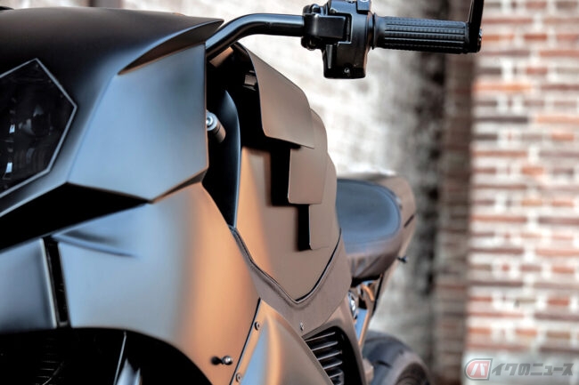 純正のプラスチック外装を取り外し、アルミ製のワンオフ(一点もの)パーツへと変更することでイメージを一新しています。