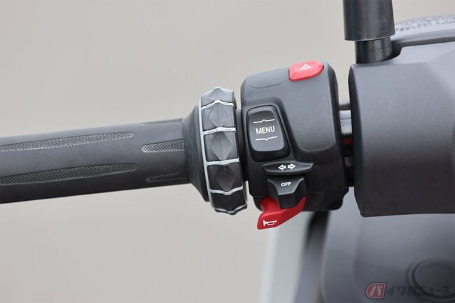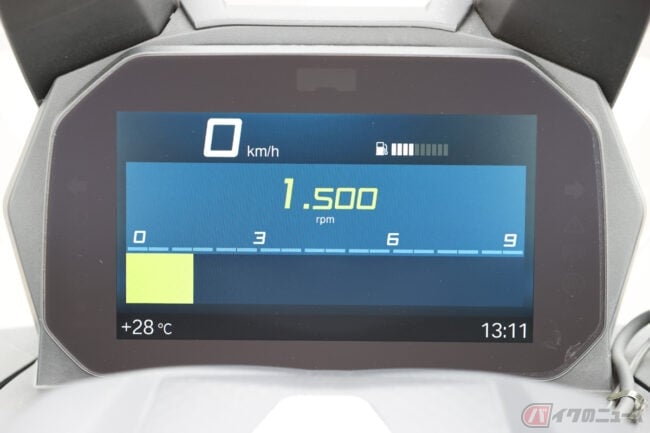 シートの前後長もあり、体格を問わず好みのポジションに収まりそうなのも特徴でしょう。メーターは6.5インチのTFTカラーモニターを採用し、通常表示では時計、気温、トリップなどの情報を選択して表示するほか、速度計を持つシンプルなもの。また左グリップにあるスイッチで選択すれば、回転計を含めた表示に切り替えることも可能です。