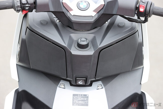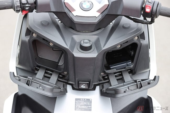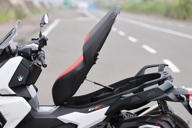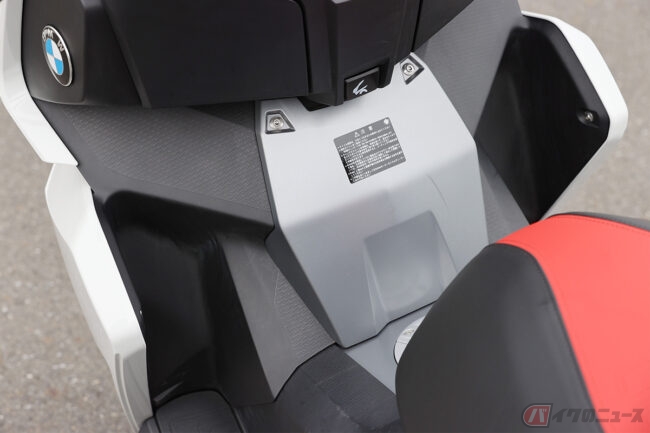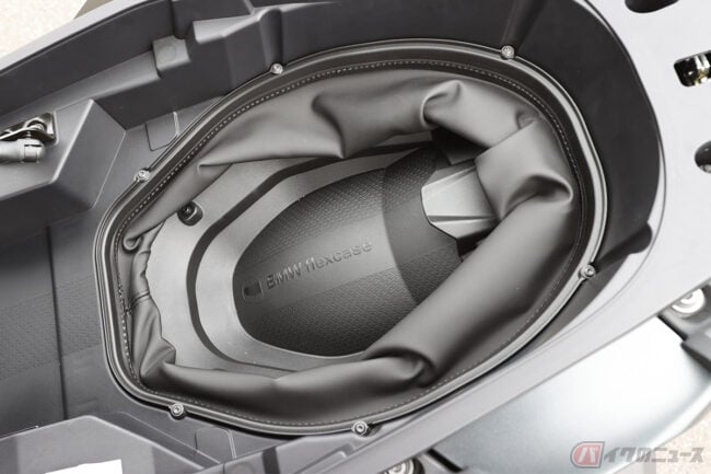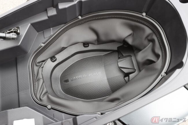 スタイルは軽快さが印象的。これは「C」シリーズ伝統の「フレックスケース」というラゲッジルーム拡張機能がそれを可能にしています。ヘルメットを収納する時はライダーがバイクから離れる時だと割り切り、折りたたみ式のヘルメット収納スペースを設けているのです。