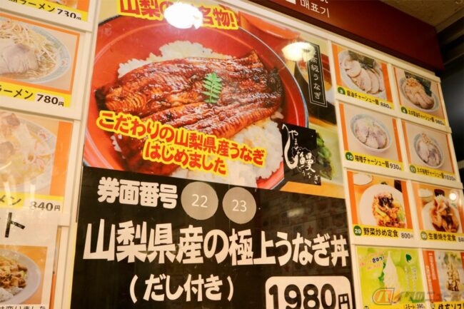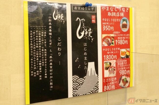 店内を見渡すと、あちらこちらで山梨県産養殖うなぎを使ったメニューがアピールされていました。次回はちょっと奮発して「うな丼」も味わってみようと思います。