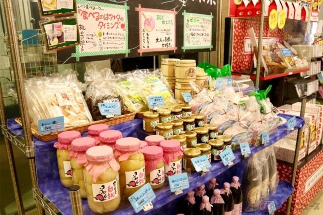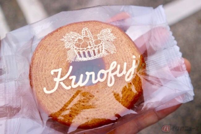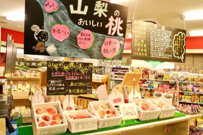 お腹を満たした後はショッピングコーナーへ。さすがフルーツ王国山梨県、訪れた時は“桃の里”として名産の桃や加工食品などが多数陳列されていました。瓶詰めなどはお土産にも良さそうです。食後のスイーツにチョイスしたバウムクーヘン「森の木霊 黒糖味」(216円)は、ツーリングで疲れた体に染み渡る美味しさでした。
