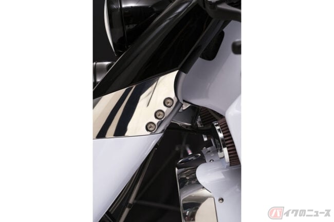 フロントフォークには3Dプリンターで製作されたクラシカルな形状のカバーを備えることでネオレトロな印象を与えています。