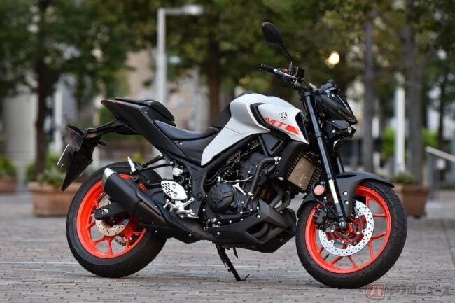 シンプルなネイキッドスタイルのヤマハ「MT-25」。コンパクトなフロント周りにマッチョなタンク、鋭いフェンダーは躍動感があり、俊敏で動物的な魅力を醸し出しています。