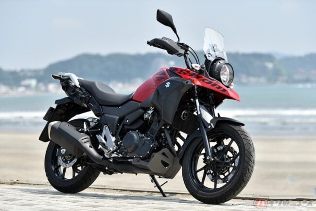 Vストローム250ABSは、スポーツアドベンチャーツアラーです。大きな単眼のヘッドライトやツンととがったフロントカウル、鳥のようなデザインが印象的です。ウィンドウスクリーン、ナックルガード、フック付きアルミキャリアなどが標準装備されています。