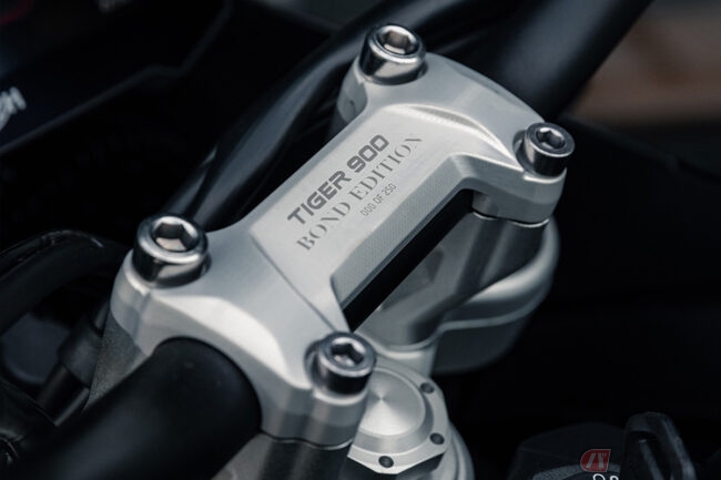 また、Tiger 900 Bond Editioではフレーム、ヘッドライトフィニッシャー、サイドパネル、サンプガード、ピリオンフットレストハンガー、補助ランプシュラウド、エンジンガードをすべてプレミアムなブラック仕上げとした上で、007 アニメーションによる始動画面や、ヒーター付きライダー/ピリオンシート(Bond Editionブランドロゴ入り)、アロー製のサイレンサーなども採用されています。