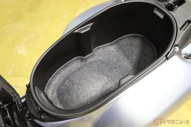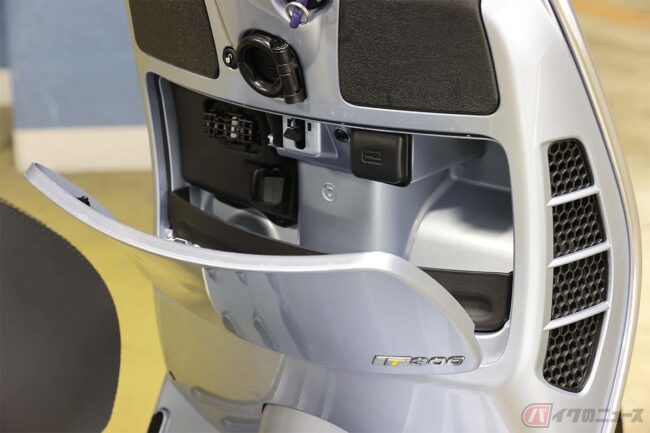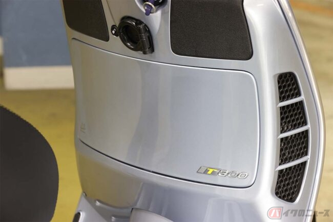 排気量は300と言いながら278ccですが、同じ排気量で先代エンジンより2.8HPもパワーアップ。吸排気系のチューニングも変わっていて、史上最強のベスパとして注目なのです。そしてそのエンジンはシートを開き、ラゲッジボックスを取り外すと簡単にアクセスできる仕組み。これもモノコックスチールフレームだからこそできる技です。小ぶりに見えてじつはスゴイ。こうした基本的構造を、ベスパは誕生した1946年から大きく変えていません。