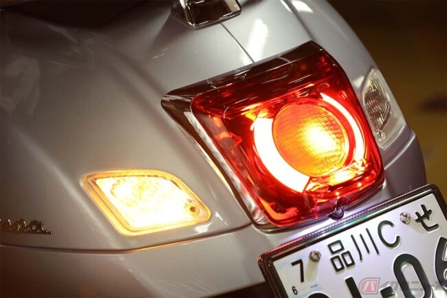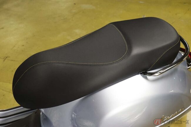 日本ブランドのスクーターが得意とする、やや後傾したリラックスポジションからすると、ベスパのそれは、ホンダのスーパーカブのようなキリっと上半身を伸ばし、膝を直角に曲げて座るようなスタイルです。つまり前方視界も良好なのです。