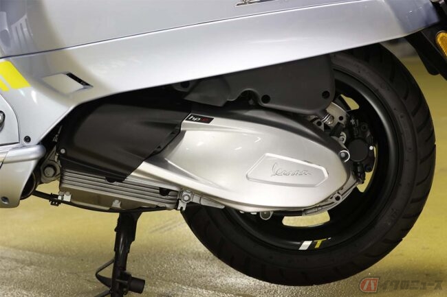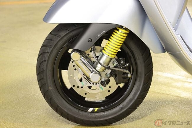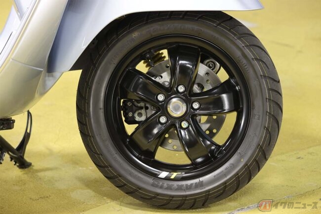 そのサイズをヤマハの「XMAX」と比較すると、全長で235mmも短いスタイルながら、前後ホイールの軸間距離は、「GTS」が1375mmで「XMAX」が1540mmと、逆にこちらは165mmと全長ほどの差がつきません。これはベスパが採用する小径ホイールに理由があります。