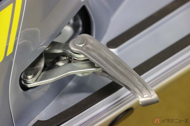 そのフロントサスペンションは、伝統のシングルアーム方式です。小径ホイールだけに、ステアリングヘッドも車体の低い場所に配置することができ、低重心感がありながら充分なストロークがあるのも小径ホイールの恩恵でしょう。