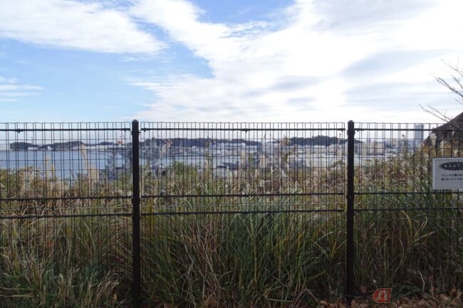公園のフェンスはけっこうな高さで、フェンスに邪魔されずに写真を撮るには思いきり腕を伸ばすか、脚立などを使わないと厳しいかもしれません。そんな時は、一度公園を出て、脇の細い道を少し下ると、見える範囲は少し狭くなりますが、植え込みの間から護衛艦群を見ることができます。