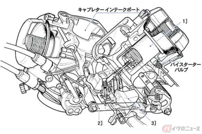 1980年代初頭の250ccクラスの基準で考えるなら、水冷、DOHC4バルブ、90度Vツインというだけで、十分に革新的だったのですが、現代の視点で「VT250F」のエンジンを見て私(筆者:中村友彦)が素晴らしいと感じるのは、Vバンク間=中央吸気・前後排気とダウンドラフト式キャブレターを採用したことです。