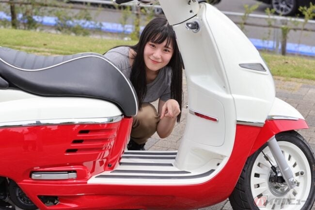 車体の大きさは、小柄な女性には少々大きく感じるかもしれないけど、特に扱えなさそうな不安を抱くほどでははない。50cc原付の1.5倍くらいの大きさで、50ccバイクが小さいと感じる人はこれくらいが丁度いいと思える大きさかも。
