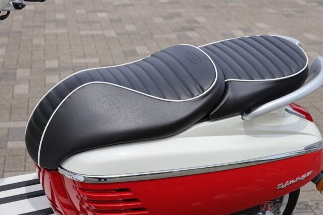 このジャンゴ125はジャンゴの中でも一番人気のツートンカラーで、下半分がレッド、上半分がオフホワイトの品のあるカラーリング。どこから見ても隙のないお洒落な風格。足を置くスペースでさえストライプ柄かと思いきや、それがまさか滑り止めだと思わせない繊細さも高評価。ジャンゴのデザイナーは視覚設計の天才か…! オプションでスクリーンを付けられるんだけど、それもデザインを邪魔しないアクセサリーになっている。もう全てが心奪われるオシャかわいさで試乗前からメロメロになってしまった。