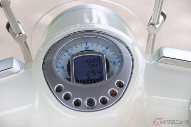 メーターは白の文字盤にスカイブルーの文字で、カルピスのパッケージのような爽やかな文字盤。デジタル部分には、時間表記と気温とオドメーターが設定されています。