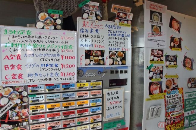 店内は休日とあってクルマで来た家族連れのお客さんも多く、賑わっています。席が空いたのを確認して、券売機の周りに貼られた品書きからアジフライを探します。