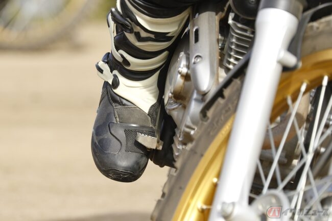 セロー250でまずは運転姿勢や足つき、ステップの位置をチェックしていきます。ここで苦戦したのは、オフロードブーツを履いた状態でステップの位置やギアの上げ下げの感覚を掴むこと。前回も最初は本当に慣れずでして、分厚く硬いつま先でギアを操作することや、リアブレーキを踏む感覚を掴むのは本当に難しいのです。