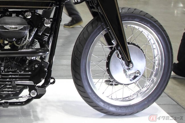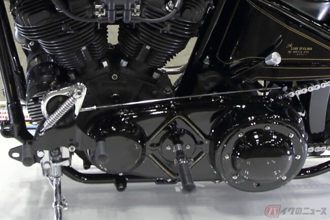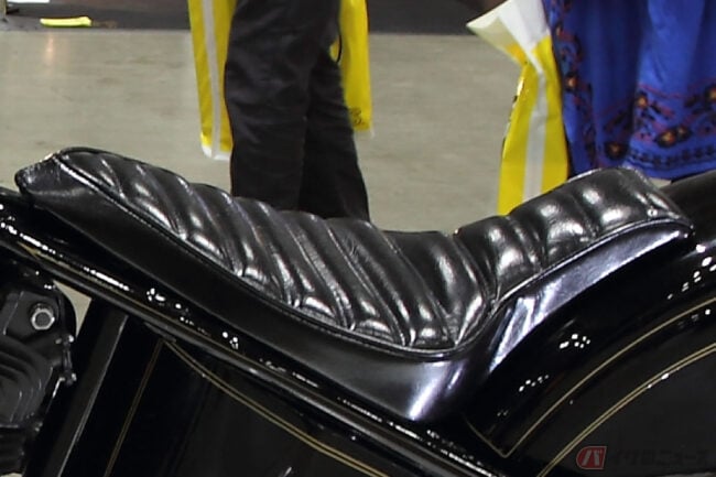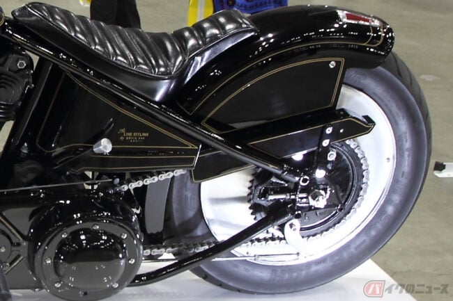もちろん、そうしたスタイルの外殻だけではなく、細かなディテールワークもこの1台の評価の要因なのですが、実際に目にしても各部はかなり丁寧な造り込みとなっており、スポーツスター用をアレンジした上でメーターダッシュが埋め込まれたタンクやサイドパネル分割型となりつつも隙のない「チリ合わせ」となったリアフェンダー、そこに埋め込まれたテールランプやオイルタンクとマフラーのクリアランス、フロントフォークに埋め込まれたクルマ用バックライトを加工したヘッドライトなども見事なフィニッシュ。