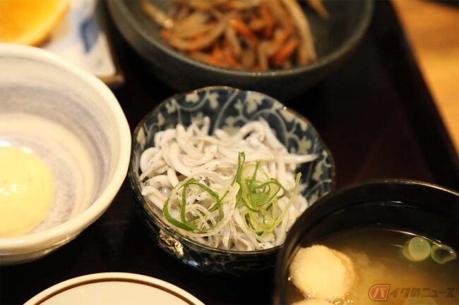 このお店のアジフライは絶品だとTさんから聞いていたので、もちろん何の迷いもなく「アジフライ定食」(770円)をオーダーします。ご主人から「しらすも北条の名産でオススメだよ」と言われ、「釜揚げしらす丼」に心が揺れます。しかし、アジフライ定食を食べるという使命を果たさなければなりません! するとシラスは小鉢で付けてくれるとのことで、心の揺れも無事に収まりました。