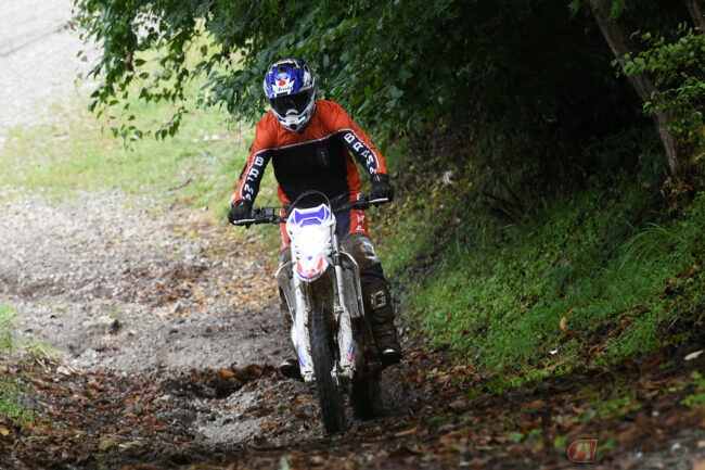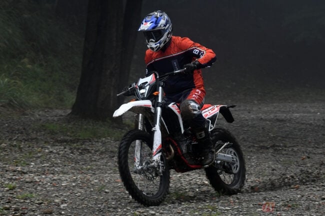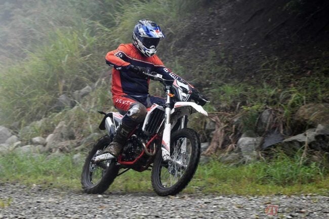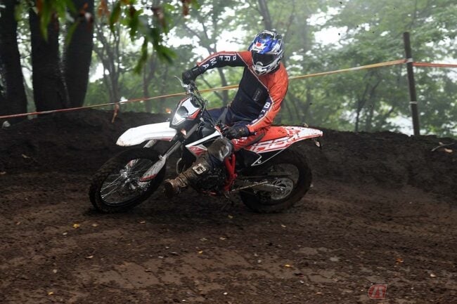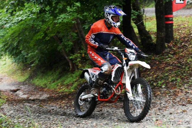 その特性、一言で表現すれば、この日走らせたRR2T 250というエンデューロコンペティションモデルより、排気量の大きなRR 2T 300のそれに近い高い性能をマイルドなパワー特性から引き出せるもの。