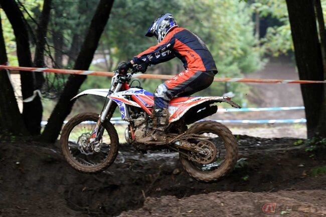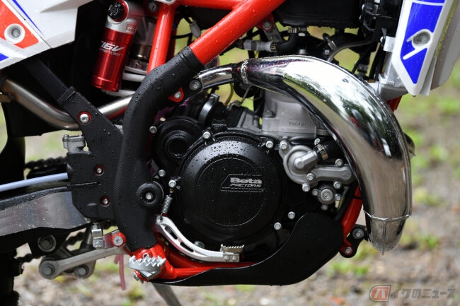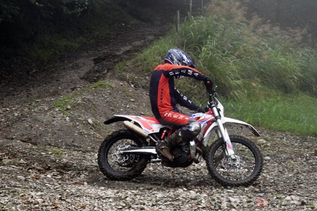 その特性も先述の通り低回転から中回転までマイルドにつながりつつ、しっかりとパワーが乗ってくる2ストらしからぬ滑らかなパワー特性で、フロントアップなどアクションがしたくなるタイプ。言葉を変えれば右手の操作で想像しやすいもの。それでも軽量な車体を軽々と動かすほどパワフルさはエンデューロバイクと同等。前後サスペンションの質感のある吸収性などもマイルドな方向ながらBETAらしさを感じます。