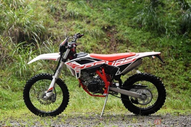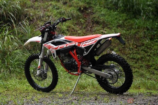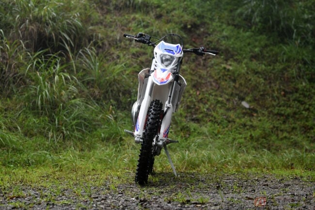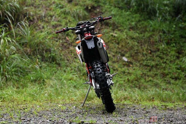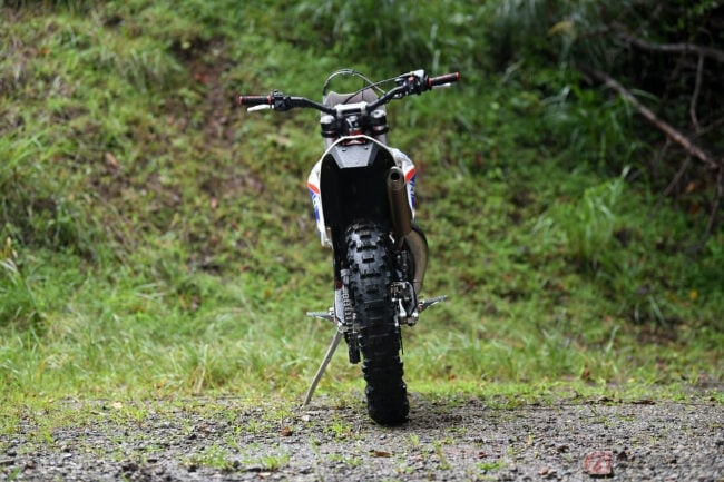 見た目の本物感の源泉は、21インチの前輪、18インチの後輪、φ41mmのインナーチューブを持つ倒立フロントフォークとアルミスイングアームを備えるなど、RR2T、RR4Tシリーズのエンデューロモデルと並べても遜色がない「本気」度です。だからサイズもエンデューロバイクそのもの。シート高こそ若干低めですが、それもドライウエイトで102キロという軽くスリムに仕立てられた車体に助けられてのこと。この時点で「免許を取ったら明日から乗れる125」という敷居の低さを感じる人は少ないはず。