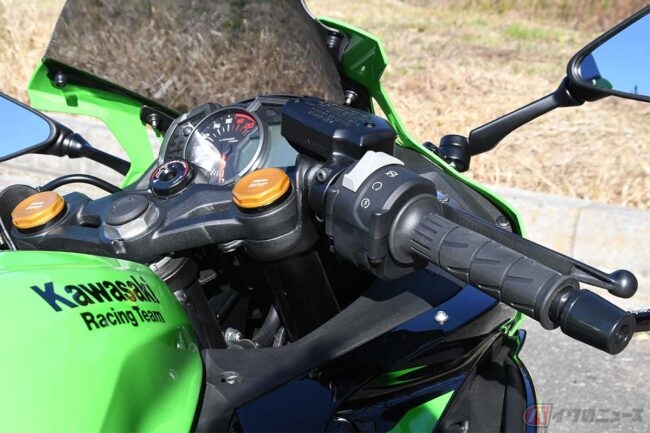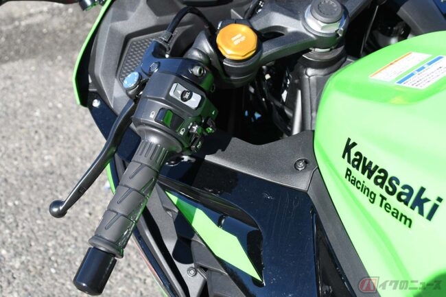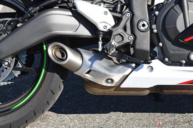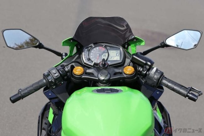 カワサキのスポーツモデルのトップエンドである「Ninja ZX-10R」を彷彿とさせるルックスは、ライダーに“これは純粋なスポーツバイクなのだ”という印象を与えます。ところが、またがってみればライディングポジションはきつい前傾ではありません。足着きも良好。身長153cmの筆者(伊藤英里)でも、両足つま先で踏ん張れる程度には地面に接地します。
