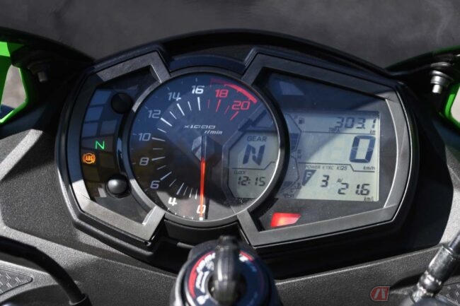2つのパワーモードと3段階のトラクションコントロール(KTRC:カワサキトラクションコントロール)を備える25Rは、街中ではほぼ、トラクションコントロール「3(最も介入度が高い)」を使用していました。パワーモードは低速から鋭い加速をする「フルパワー」、ゆるやかな加速の「ローパワー」の2つがあり、どちらも試したところ、交通量やストップ&ゴーが多い状況ではローパワーの方が扱いやすいと感じました。