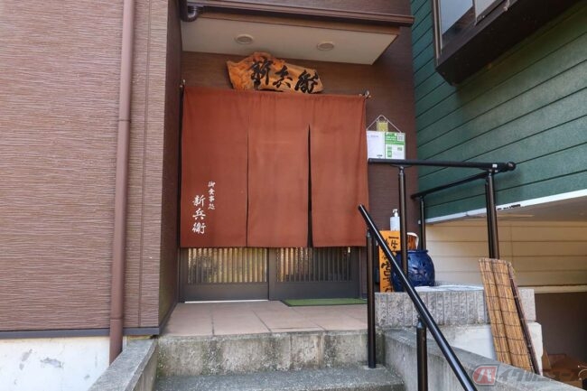 今回の目的地である「新兵衛」はこの近くと聞いていたのですが、これがなかなか見つかりません。細い道に入って行こうと思ったら「新兵衛」と書かれた看板を見つけました。しかしその先にお店はありません。T字路に突き当たってふと脇を見ると、そこがお店の駐車場ではないですか! しかしお店は影も形もありません。Uターンしてゆっくり戻るとさらに脇道を見つけ、数十メートル進むと視界の隅に暖簾を発見しました。家屋かと思ったところにお店の入り口があったのです。文章にすると大した時間ではありませんが、けっこうウロウロと探し回ったので、見つけた時は小躍りしそうな勢いでした。
