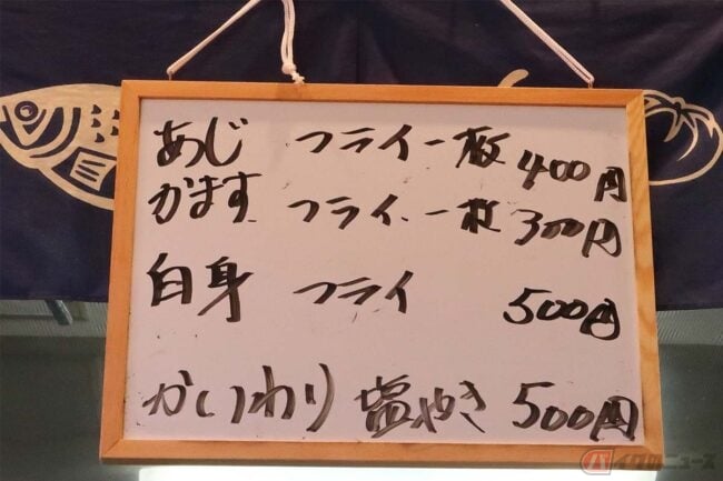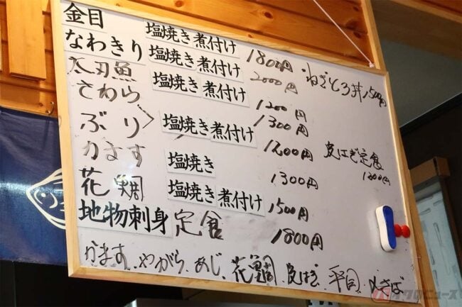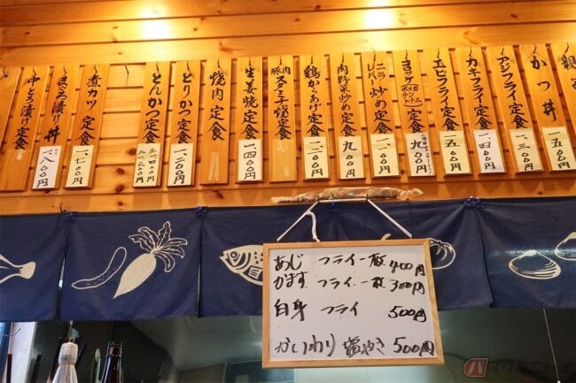 メニューはカウンターの上にある木札とホワイトボード。今回は何の迷いも無くアジフライ一択の予定ですが、念の為確認します。ホワイトボードに書かれた「地物刺身定食」をはじめ、「やがら」とか「皮はぎ」とか、何だかソソられる名前があります。「なわきり」という魚も気になってきました。待ち時間があるとついつい目移りして心が揺れ出しますが、ここで救世主が登場しました。先に頼まれたお客さんのアジフライ定食が出てきたのです。立派なアジフライが皿の上で輝いています。迷いは完全に消滅しました。ところがおかみさんから「今日は“かますフライ”がオススメだったんだ」と、常連と思われるお客さんに一言。え!? と思考が混乱しましたが、ここは冷静に「アジフライ定食」をお願いします。