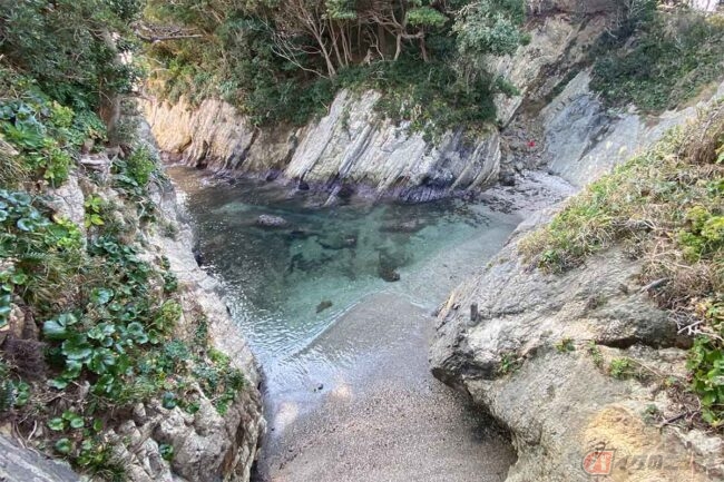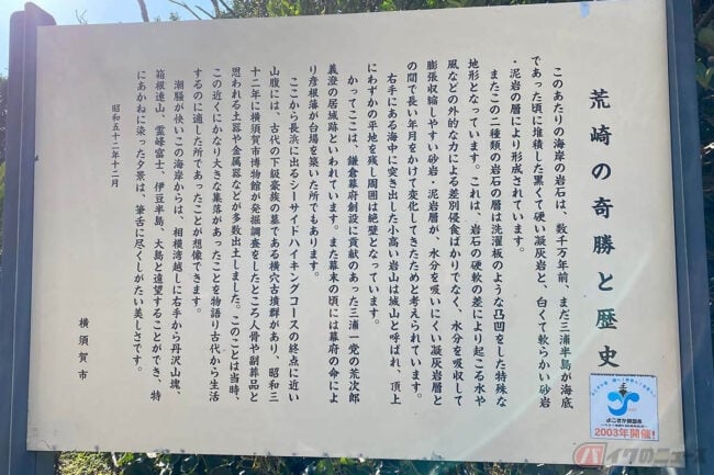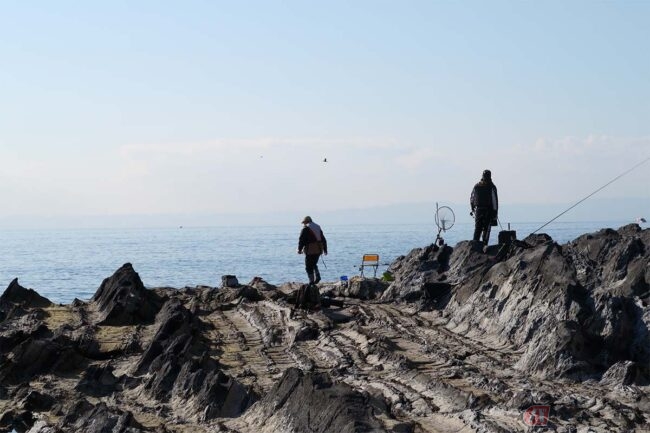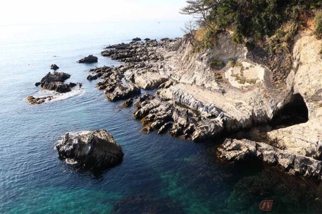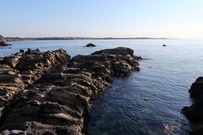食後のショートツーリングは、相席のお客さんに教えていただいた「荒崎公園」へ向かいます。駐車場にバイクを停めて海まで散策です。海岸はゴジラの背中のような「三浦層群」という独特の地形や海食洞が見れます。天気が良かったこともあって海がとても綺麗です。もしやこの岩場にアジがいるのか? などと覗き込んでみます。夏に素潜りして探してみようかなどと妄想しながら、帰路につきました。