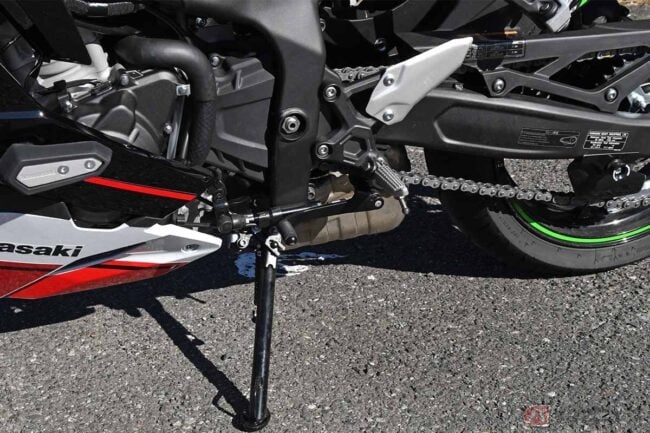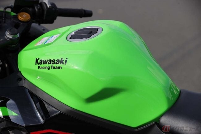 足着き具合は、両足を下ろしてつま先が接地し、ある程度力を入れられます。ここでひとつ気になったのは、シートの形状です。筆者が過去に乗ったことがある、同じくカワサキの「Ninja 250」では、タンクに向かってシートが細く絞り込まれ、この形状が足着きの良さに貢献している印象がありました。一方、25Rの場合は比較的平坦な形状をしているため、足を下ろしたときに太ももの内側にシートの角部分が当たってしまい、その分、足が横に向いてしまうことが影響しているようでした。