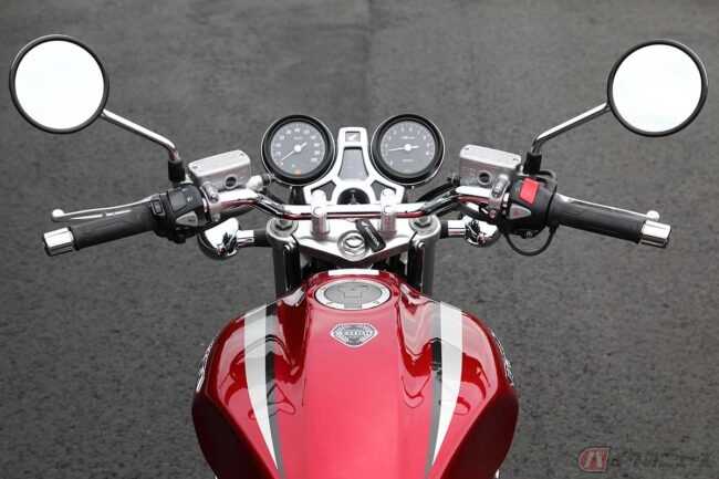また、ミッションのタッチが素晴らしく、高い剛性感をともないながら“カツーン、カツーン”と遊びなく切り換わっていきます。その組み付け精度はいかにも緻密で、こうした操作系の良し悪しでバイクの印象は大きく左右されるものですが、この点においても文句なしの完成度を味わえるはずです。