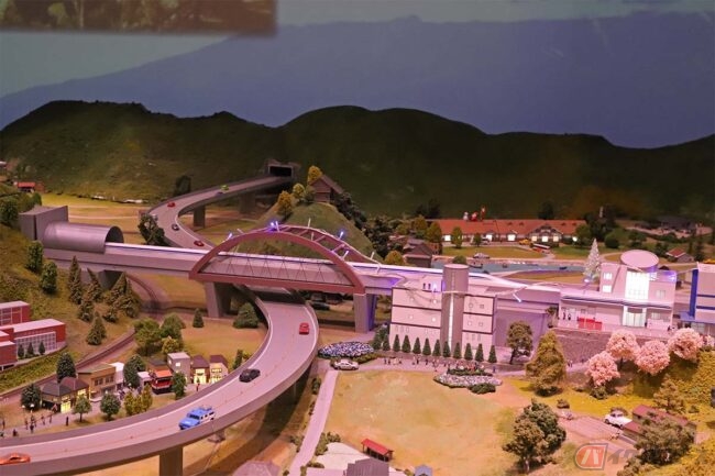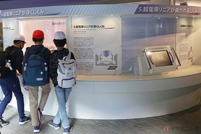 建物は3階まであり、ほかにはリニア開発の歴史や超電導によってリニアモーターカーが浮上走行する原理や解説、リニア中央新幹線の工事の様子などが分かりやすく展示されています。また、リニアの鉄道模型ジオラマや、リニアのことがよくわかる映像作品の上映などもあり、飽きずに楽しみながら学べるよう工夫されています。