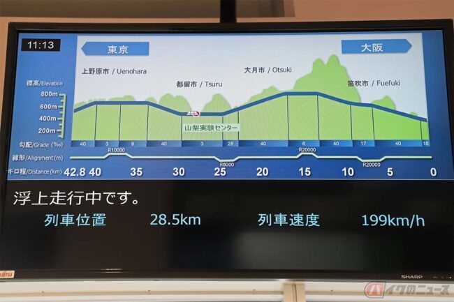 リニアの走行試験は毎日行われるわけではなく、予定は毎週金曜日の夕方に翌週分の運転予定日が発表されます(リニア見学センターのホームページなどで確認可能)。ただ、試験が行われても1日に1往復しか走らない日や、何度も走るけれど時速500キロで運転されない日もあるなど、なかなかに見学者の運が試される施設でもあります。