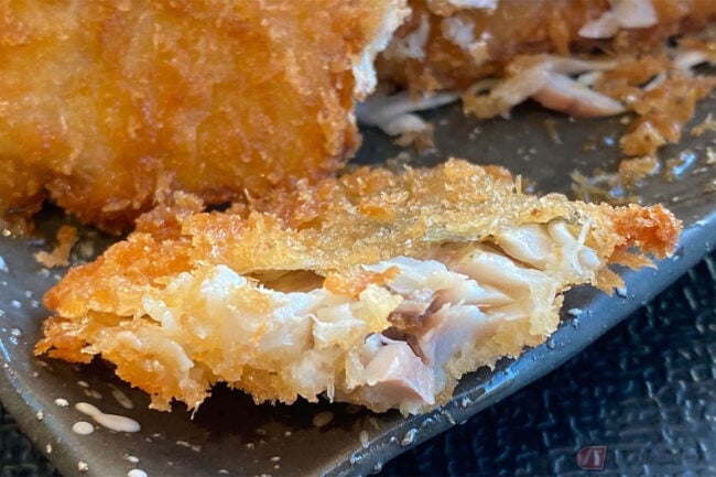 席に戻り、早速アジフライに箸を入れます。アジの反り具合が新鮮さを語っています。粗めのパン粉を使ったサクサクの揚げたてで、身は柔らかめ、うっすら塩味がします。これはソースなどを付けなくても美味しくいただけるアジフライ、かなりレベル高めです!