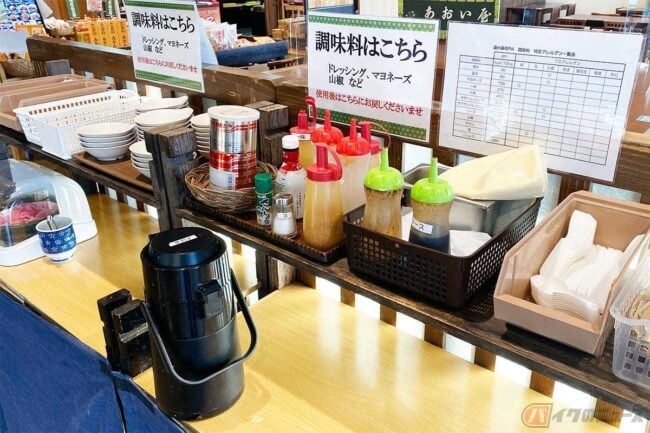 店名にもありますが、とろろが名物のようで「とろろ汁」を追加することもできます。セルフサービスの温かいお茶を飲みながら窓際の席で定食が出来上がるのを待ちます。窓からはバイクの姿も見えるので防犯上も安心です。