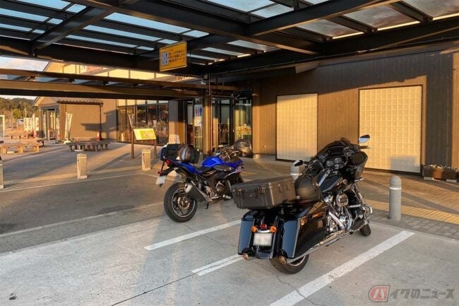 西日が当たる背中は暖かく、ヒーティングジャケットのスイッチをオンにしなくても走れるくらいの気温ですが、やはり冷えてきたので一度休憩しようと「遠州森町PA」(上り)に入ります。給油以外は、あまりSAやPAに入らないで走り続けてしまう筆者ですが、寒さには弱いのです。