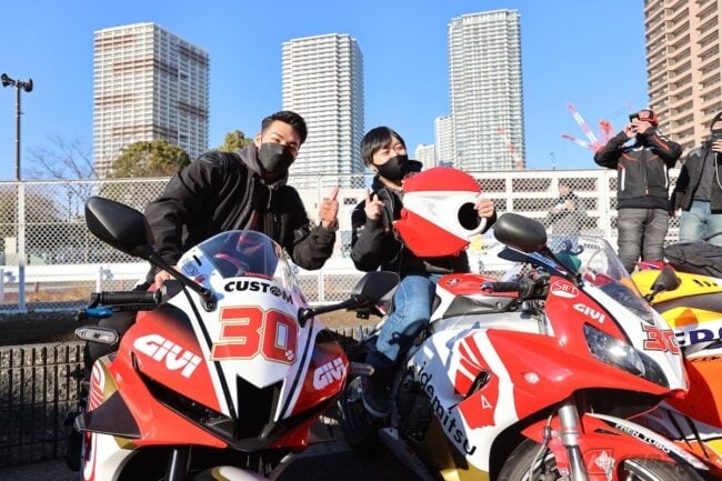 サイン会では、中上選手のゼッケンである「30」を付けた中上レプリカ仕様のホンダ「CBR600RR」で来場したライダーが、スマートフォンでバイクの画像を見せると、なんと一緒に駐輪場まで歩き、そのバイクに跨ってツーショット写真を撮るという大サービスも。